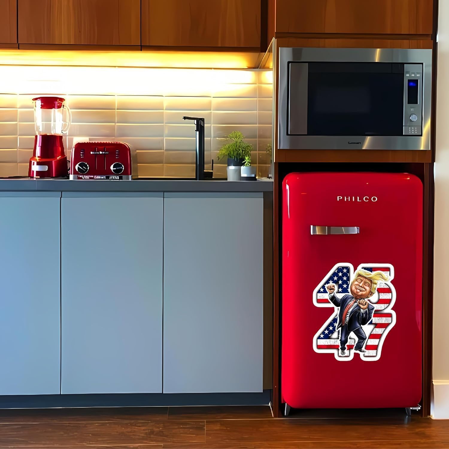 Ready to ride, robust, and bold. This die-cut vinyl decal, which is ideal for cars, trucks, laptops, tumblers, toolboxes, and more, features a humorous Trump caricature alongside the "47" stars and stripes.
